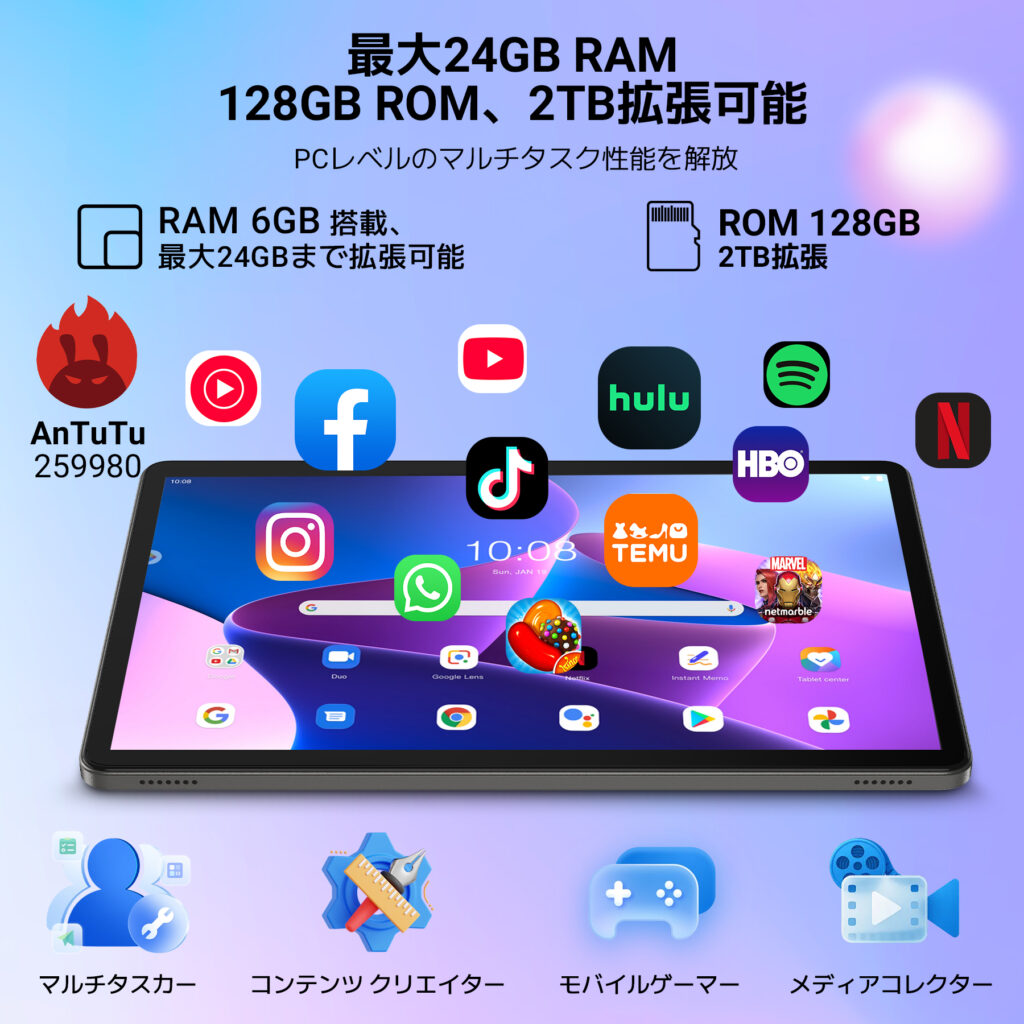 このタブレットは、軽めのゲームやYoutube動画視聴、読書、ビデオ通話、Web閲覧などに使えるそこそこのスペックで、低予算ながらも最新のAndroid 16に対応しています。
