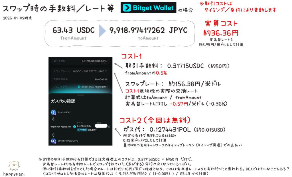プライベートウォレットの Bitget Wallet 経由のDEXで暗号資産のスワップ/ブリッジの取引をした際のコストやレート等の見方をまとめておきます。 JPYCは法的に暗号資産でなく電子決済手段ですが他の暗号資産と同様に取引できるため、本記事の例ではJPYCか... -