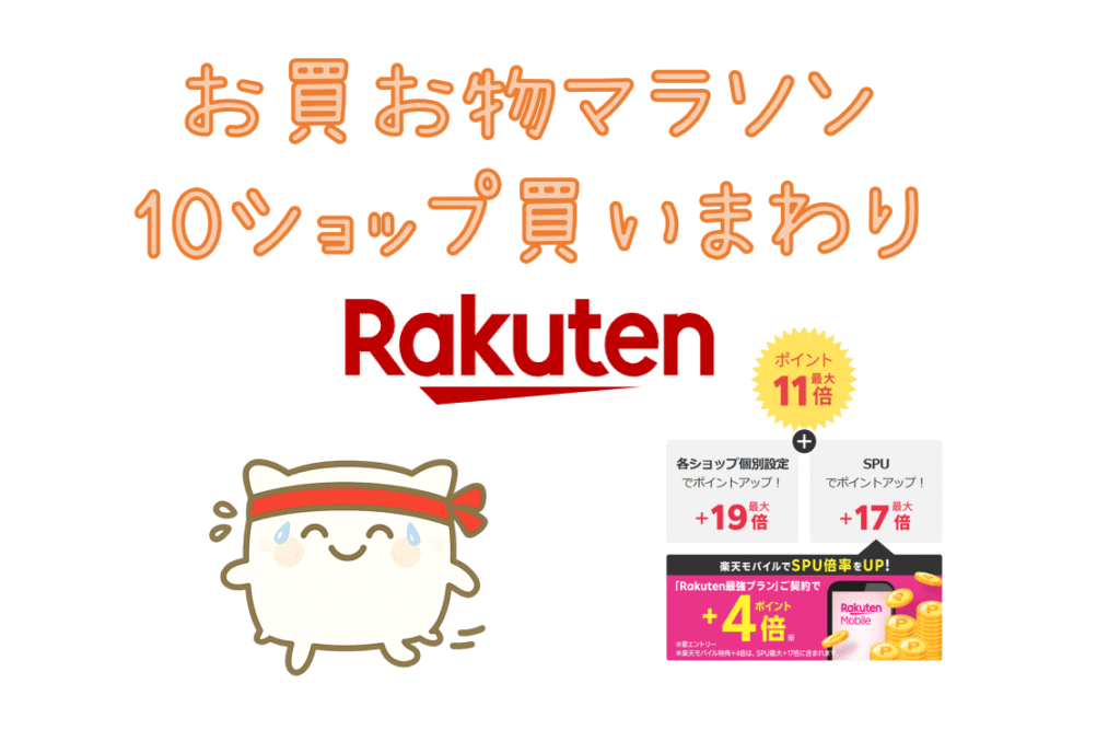楽天市場のお買い物マラソンの買いまわりの特典が最大になる 10ショップでのお買い物を実践してみました。 獲得できるポイントは 通常還元分の1倍に +9倍で計10倍、つまり 10%還元となります。 還元率につられて余計なものを買わないように気を付けながら... -
