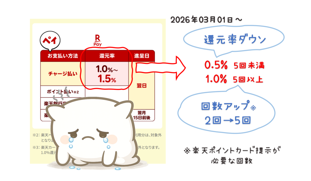 2025年末に大きな改悪が出尽くしたと思って油断していたところに悲報…新年早々に楽天ペイの大改悪です。 【大改悪】楽天ペイが還元率0.5%ダウン&ポイントカード提示回数5回にアップ(実質還元率1%ダウンか) 2026年3月1日より、みんな大好き楽天キャッシ... -