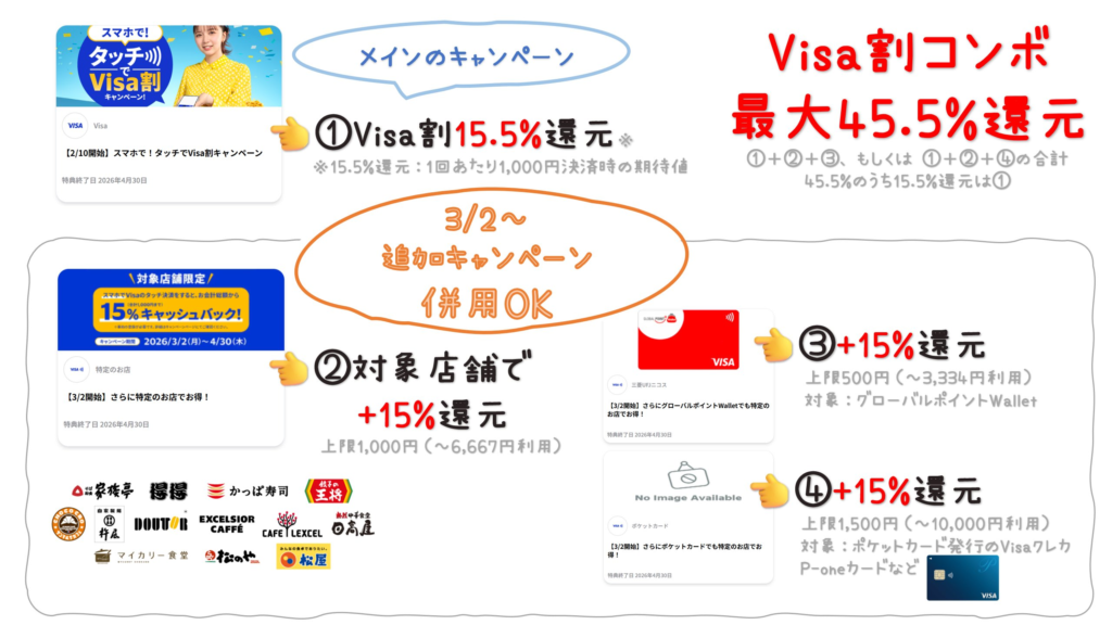 3/2から追加のキャンペーンが開催され、Visa割が対象店舗でさらにパワーアップします。