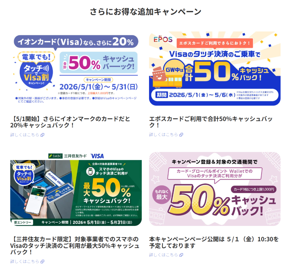 【5月は電車で最大50%還元】Visa割タッチ決済で乗車料金キャッシュバック