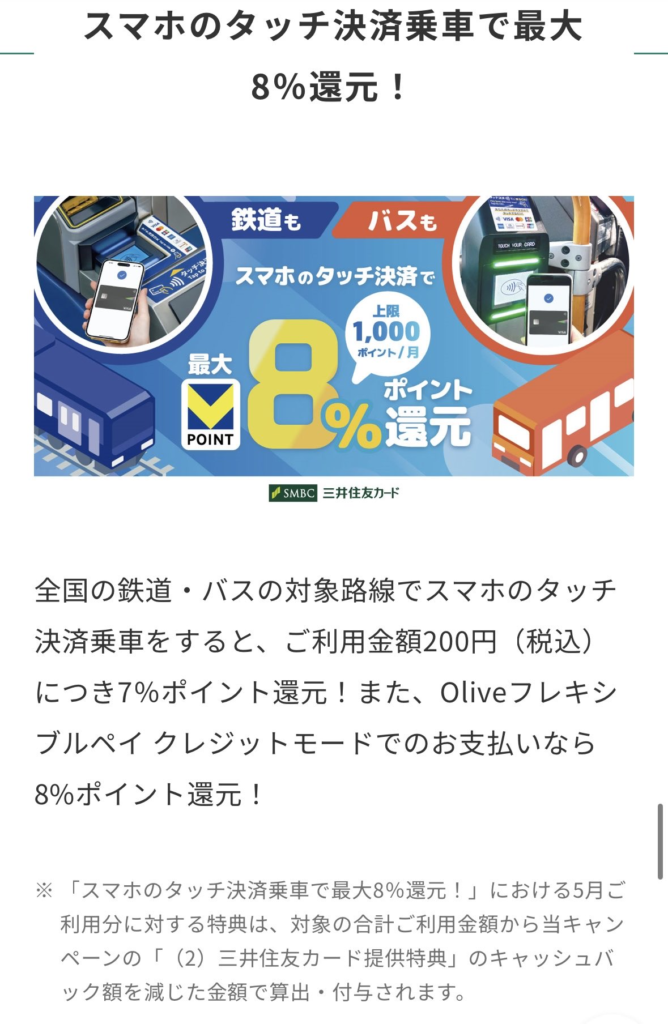 上記キャンペーンの対象となっている三井住友カード、Oliveフレキシブルペイと言えば、先日「スマホのタッチ決済乗車で最大8%還元!」を開始したばかりですが、今回のキャンペーンとは以下の条件で併用できるようです。